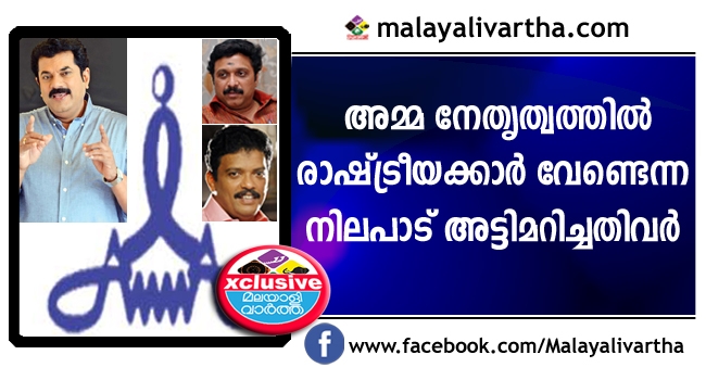 പത്താനപുരം തെരഞ്ഞെടുപ്പിനിടെ ഉണ്ടായ വിവാദങ്ങള് അമ്മയില് അഭിപ്രായഭിന്നത രൂക്ഷമാക്കിയെന്നും പൊതുസമൂഹത്തില് അവമതിപ്പുളവാക്കുന്നെന്നും അതിനാല് രാഷ്ട്രീയക്കാര് നേതൃത്വത്തിലേക്ക് വരേണ്ടെന്നും ഉള്ള നിര്ദ്ദേശം അട്ടിമറിച്ചു