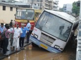 റോഡിലെ ഗട്ടര് ഒഴിവാക്കുന്നതിനിടെ കെ.എസ്.ആര്.ടി.സി ഓടയില് വീണു; തലനാരിഴയക്ക് അപകടം ഒഴിവായി