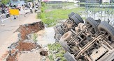 പാലക്കൽ കണിമംഗലം പാടത്ത് റോഡ് ഇടിഞ്ഞ് ടോറസ് ലോറി പാടത്തേക്കു മറിഞ്ഞു; ഡ്രൈവർ രക്ഷപ്പെട്ടത് അത്ഭുതകരമായി