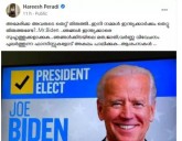 'അമേരിക്ക അവരുടെ തെറ്റ് തിരുത്തി. ഇനി നമ്മൾ ഇന്ത്യക്കാർക്കും തെറ്റു തിരുത്തണ്ടേ? മിസ്റ്റര് ബെെഡന്, ഞങ്ങൾ ഇന്ത്യക്കാരെ സുഹൃത്തുക്കളാക്കുക. ഞങ്ങൾക്കിടയിലെ മത,ജാതി,വർണ്ണ വിവേചനം പുലർത്തുന്ന ഫാസിസ്റ്റുകളോട് അകലം പാലിക്കുക....' ജോ ബെെഡന് ആശംസകളുമായി നടന് ഹരീഷ് പേരടി