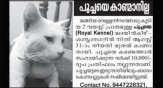 ഈ ചിത്രത്തില് കാണുന്ന പൂച്ചയെ കഴിഞ്ഞ മാസം 31 മുതല്ക്കാണ് കാണാതായി. കണ്ടെത്തി തിരികെ നല്കുന്നവര്ക്ക് പതിനായിരം രൂപയുടെ കനപ്പെട്ട പ്രതിഫലം നല്കാനൊരുക്കമാണെന്നാണ് ഗൃഹനാഥന്. തിരുവനന്തപുരം മലയന്കീഴ...
