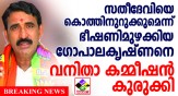 ശബരിമലയില് യുവതികളെ പ്രവേശിപ്പിക്കണമെന്ന സുപ്രീംകോടതി വിധി നടപ്പാക്കണമെന്ന് ചാനല് ചര്ച്ചയില് ആവശ്യപ്പെട്ട മുന് എം.പി പി.സതീദേവിക്കെതിരെ വധിഭീഷണി മുഴക്കിയ ബി.ജെ.പി നേതാവ് ബി. ഗോപാലകൃഷ്ണനെതിരെ വനിതാ കമ്മീഷന് കേസെടുത്തു