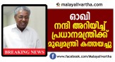 ഓഖി ദുരന്തത്തിൽ വലഞ്ഞ കേരളത്തെ സഹായിച്ച കേന്ദ്ര സർക്കാരിന് നന്ദി അറിയിച്ച് മുഖ്യമന്ത്രി പിണറായി വിജയൻ പ്രധാനമന്ത്രിക്ക് കത്തയച്ചു. ദുരന്ത മേഖലകൾ സന്ദർശിക്കാൻ പ്രധാനമന്ത്രി സമയം കണ്ടെത്തിയതിലും മുഖ്യമന...