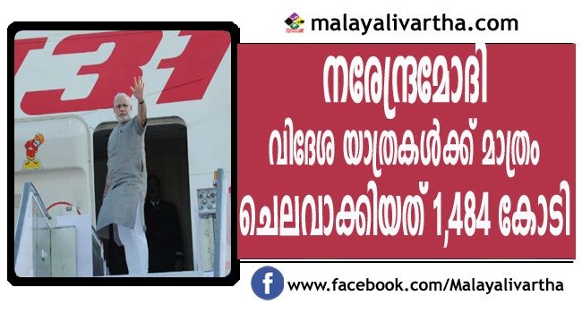 പ്രധാനമന്ത്രി നരേന്ദ്രമോദി വിദേശ യാത്രകള്ക്ക് മാത്രം ചെലവാക്കിയത് 1,484 കോടി. 2014 ജൂണ് മുതല് 84 രാജ്യങ്ങള് സന്ദര്ശിച്ചതിനാണ് ഇത്രയും തുക ചെലവാക്കിയത്. ചാര്ട്ടേഡ് വിമാനങ്ങള്ക്കും, വിമാനങ്ങളുടെ അറ്റകുറ്റപ്പണിക്കും, ഹോട്ട്ലൈന് സംവിധാനം ഏര്പ്പെടുത്തിയതിനും ചെലവായ തുകയാണിത്.