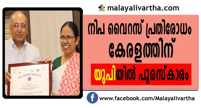 നിപ വൈറസിനെ ഫലപ്രദമായി പ്രതിരോധിക്കാന് സഹായകമായ നേത്വ മികവിന് ഉത്തര്പ്രദേശിന്റെ ആദരം. വാരാണസി ബനാറസ് ഹിന്ദു യൂനിവേഴ്സിറ്റിയുടെ എമര്ജന്സി മെഡിസിന് അസോസിയേഷന് ദേശീയ സമ്മേളനത്തിലാണ് കേരളത്തിന്റെ പുരസ്കാരം. എമര്ജന്സി മെഡിസിന് അസോസിയേഷന് ലീഡര്ഷിപ്പിന്റെ പുരസ്കാരം മന്ത്രി കെ.കെ. ശൈലജ ഏറ്റുവാങ്ങി.