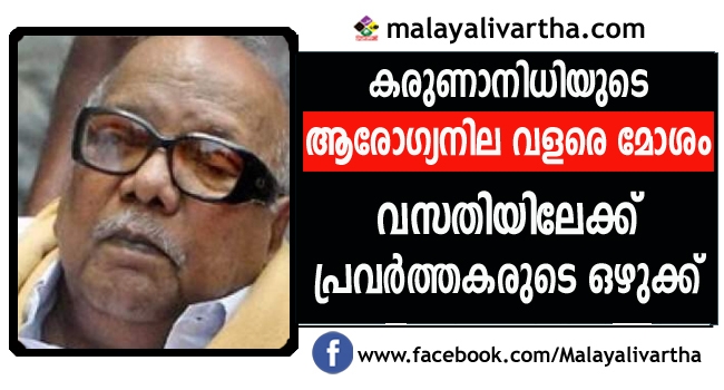 കരുണാനിധിയുടെ ആരോഗ്യനില വളരെ മോശമായതായി റിപ്പോര്ട്ട്; ആരോഗ്യനില മോശമായ വാര്ത്തയറിഞ്ഞ് വസതിക്ക് മുന്നിലേക്ക് ഡിഎംകെ പ്രവര്ത്തകര് കൂട്ടമായി എത്തുന്നു; മകനും ഡിഎംകെ നേതാവുമായ എം.കെ.സ്റ്റാലിനുമായി നേതാക്കളുടെ കൂടിക്കാഴ്ച