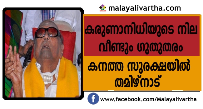 തമിഴ്നാട് മുന് മുഖ്യമന്ത്രിയും ഡി.എം.കെ അദ്ധ്യക്ഷനുമായ കരുണാനിധിയുടെ നില വീണ്ടും ഗുതുതരം; കരളിന്റെയും വൃക്കകളുടേയും പ്രവര്ത്തനം 80 ശതമാനവും നിലച്ചു; ഏതു നിമിഷവും പ്രവര്ത്തിക്കുന്ന വിധത്തില് സേനയെ സജ്ജമാക്കി നിറുത്തണമെന്ന എല്ലാ പോലീസ് മേധാവികള്ക്കും നിര്ദേശം