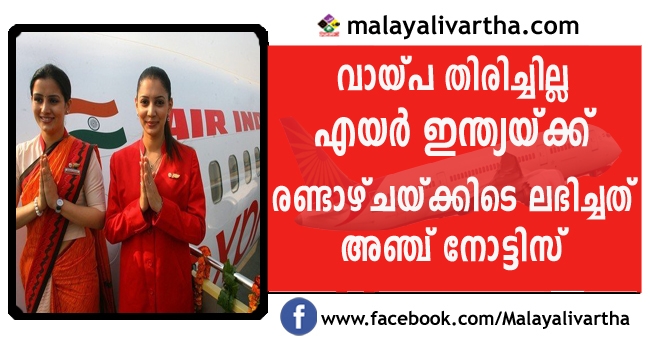 വായ്പ തിരിച്ചടയ്ക്കുന്നതില് വീഴ്ച വരുത്തിയതിനെ തുടര്ന്ന് എയര് ഇന്ത്യയ്ക്ക് രണ്ടാഴ്ചയ്ക്കിടെ ലഭിച്ചത് അഞ്ച് നോട്ടിസുകള്; മൂന്നു ബാങ്കുകളും രണ്ടു വിമാന കമ്പനികളും എയര് ഇന്ത്യയ്ക്കു മുന്നറിയിപ്പു നോട്ടിസ് നല്കി