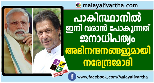 അയല് രാജ്യങ്ങളുമായി സമാധാനപാതയിലൂന്നിയുള്ള വികസനത്തിന് തുടക്കമിടാന് പോകുന്ന ഇമ്രാന്റെ പാര്ട്ടിയ്ക്കും ഭരണത്തിനും എല്ലാവിധ അഭിനന്ദനങ്ങളും ; ഇമ്രാന് ഖാന്റെ ഭരണത്തോടെ പാകിസ്താനില് ജനാധിപത്യം വേരുറപ്പിക്കുമെന്ന് നരേന്ദ്ര മോദി