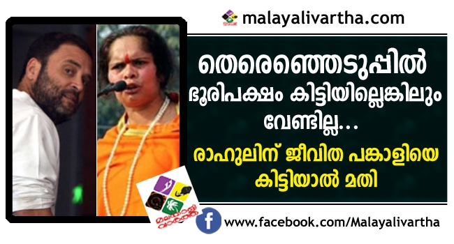 'ബാബ ഗോരഖ് നാഥിന്റെ അനുഗ്രഹത്തിനായി പതിവായി ഞാന് ഈ ക്ഷേത്രത്തില് വരാറുണ്ട്. പക്ഷേ ഇത്തവണ വന്നത് ഒരു പ്രത്യേക ലക്ഷ്യത്തോടുകൂടിയാണ്. അടുത്ത തവണ സര്ക്കാര് രൂപീകരിക്കാനുള്ള ഭൂരിപക്ഷം കോണ്ഗ്രസിന് ലഭിച്ചില്ലെങ്കിലും അദ്ധ്യക്ഷന് രാഹുല് ഗാന്ധിക്ക് ജീവിതപങ്കാളിയായി ഒരു ഭാര്യയെ കിട്ടാന് ഞാന് പ്രാര്ത്ഥിക്കുകയാണ്'എന്ന് സാധ്വി പറഞ്ഞു.