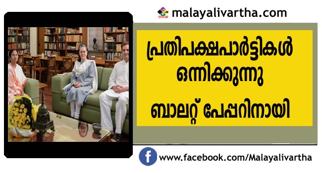തിരഞ്ഞെടുപ്പില് ഇലക്ട്രോണിക് വോട്ടിങ് മെഷീനു പകരം ബാലറ്റ് പേപ്പറുകള് ഉപയോഗിക്കണമെന്ന ആവശ്യവുമായി പ്രതിപക്ഷപാര്ട്ടികളെ ഒരുമിപ്പിച്ച് മമത ബാനര്ജി