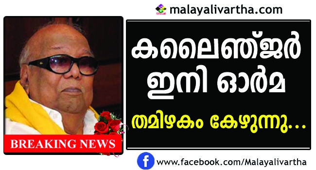 തമിഴ്നാട്ടില് ദ്രാവിഡ രാഷ്ട്രീയത്തില് അഞ്ച് പതിറ്റാണ്ടിലധികം നിറഞ്ഞ് നിന്ന ശേഷമാണ് കലൈഞ്ജര് കരുണാനിധി കളമൊഴിഞ്ഞത്. ഡി.എം.കെയുടെ തലപ്പത്ത് അദ്ദേഹം അര നൂറ്റാണ്ട് പൂര്ത്തിയാക്കിയത് വിപുലമായി ആഘോഷിക്കാന് പ്രവര്ത്തകര് തീരുമാനിച്ചിരുന്നു. ആ സമയത്താണ് അദ്ദേഹം ആശുപത്രിയിലായത്. ഒരു പാര്ട്ടിയുടെ അധ്യക്ഷനായി ഇത്രയും കാലം ഒരാള് തുടരുന്നത് ലോകത്ത് തന്നെ അപൂര്വങ്ങളില് അപൂര്വം. തിരക്കഥകളിലൂടെയും അതിലെ സംഭാഷണങ്ങളിലൂടെയും കവിതകളിലൂടെയും നാടകങ്ങളിലൂടെയും കഥകളിലൂടെയും തമിഴകത്തെ ഇളക്കിമറിച്ച തൂലികയായിരുന്നു കലൈഞ്ജരുടേത്.
