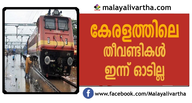 കേരളത്തിലെ ഭൂരിഭാഗം തീവണ്ടികളും ഇന്ന് ഓടില്ല .മിക്കയിടത്തും പാളത്തില് വെള്ളം കയറിയിരിക്കുന്നതിനാലാണ് റെയില്വേയുടെ അറിയിപ്പ്