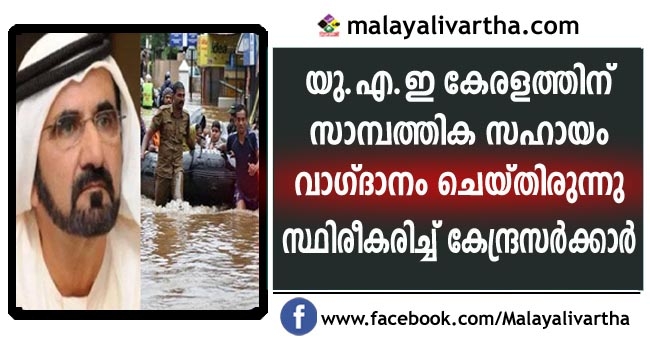 പ്രളയക്കെടുതിയില് കേരളത്തിന് കൈത്താങ്ങായി യു.എ.ഇ സാമ്പത്തിക സഹായം വാഗ്ദാനം ചെയ്തുവെന്ന് സ്ഥിരീകരിച്ച് കേന്ദ്രസര്ക്കാര്