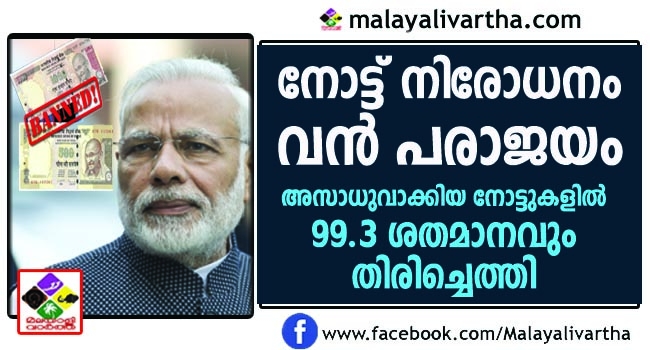 കള്ളപണം പിടിക്കാനെന്ന പേരില് അസാധുവാക്കിയ നോട്ടുകളിൽ 99.3 ശതമാനം നോട്ടുകളും തിരിച്ചെത്തിയതായി റിസര്വ്വ് ബാങ്ക്. ഇതോടുകൂടി കള്ളപ്പണം പിടിക്കാനെന്ന പേരില് നരേന്ദ്ര മോദി സര്ക്കാര് നടപ്പാക്കിയ നോട്ട് നിരോധനം സമ്പൂര്ണ്ണ പരാജയമെന്ന കാര്യമാണ് വ്യക്തമാകുന്നത്.