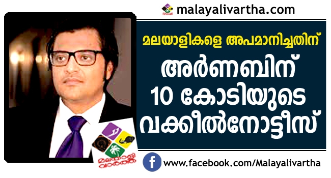 എവിടെനിന്നോ പണം വാങ്ങി രാജ്യത്തെ അപമാനിക്കുന്ന പ്രത്യേക ഗ്രൂപ്പാണ് മലയാളികള് എന്ന തരത്തിലുളള അര്ണബ് ഗോസ്വാമിയുടെ പരാമര്ശത്തിനെതിരെ; അര്ണബിന് പത്തു കോടിയുടെ ഗോസ്വാമിക്ക് വക്കീല് നോട്ടീസ്