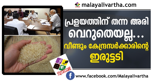അടിയന്തര സഹായമായി 2000 കോടി രൂപ ചോദിച്ച കേരളത്തിന് കേന്ദ്രം നൽകിയത് 500 കോടി ; പ്രളയകാലത്തു കേരളത്തിനു നല്കിയ അധിക അരിയുടെ വില കേന്ദ്ര ദുരിതാശ്വാസ നിധിയില്നിന്ന് ഈടാക്കും ; അരിക്ക് കിലോഗ്രാമിന് 25 രൂപ നിരക്കില് നല്കണം