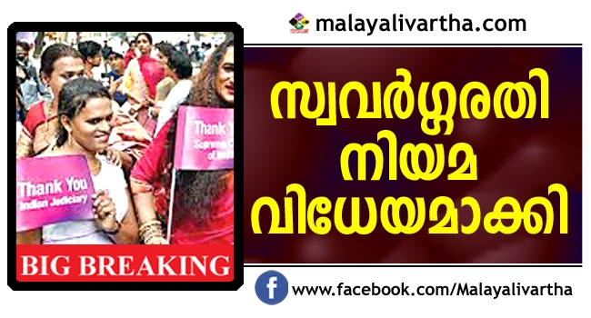 സ്വവർഗരതി നിയമവിധേയമാക്കി സുപ്രീംകോടതിയുടെ സുപ്രധാനവിധി. സ്വവർഗ രതി ക്രിമിനൽ കുറ്റമല്ല. സ്വവർഗ ബന്ധങ്ങൾ അംഗീകരിക്കണമെന്നും എല്ലാത്തരം അടിച്ചമർത്തലുകളും നിയമവിരുദ്ധമാണെന്നും കോടതി നിരീക്ഷിച്ചു. ജീവിക്കാനുള്ള സ്വാതന്ത്ര്യമാണ് പ്രധാനമെന്നും ചീഫ് ജസ്റ്റിസ് ദീപക് മിശ്ര അദ്ധ്യക്ഷനായ അഞ്ചംഗ ബെഞ്ച് പറഞ്ഞു. സ്വവർഗരതി ക്രിമിനൽ കുറ്റമാക്കുന്ന ഭരണഘടനയിലെ 377ാം വകുപ്പ് കോടതി റദ്ദാക്കി. ഒരാൾക്ക് ആയാളുടെ വ്യക്തിത്വത്തിൽ നിന്ന് ഒളിച്ചോടാനാവില്ല. സാധാരണ പൗരൻമാർക്ക് ലഭിക്കുന്ന മൗലികാവകാശങ്ങൾ എൽ.ജി.ബി.ടി വിഭാഗത്തിനും ലഭിക്കണമെന്നും സുപ്രീംകോടതി വിധിയിൽ പറയുന്നുണ്ട്.