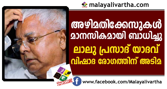 ആര്ജെഡി തലവനും മുൻ ബിഹാർ മുഖ്യമന്ത്രിയുമായ ലാലു പ്രസാദ് യാദവ് വിഷാദ രോഗത്തിന് അടിമയെന്ന് മെഡിക്കല് റിപ്പോര്ട്ട്. രാജേന്ദ്ര ഇന്സ്റ്റിറ്റ്യൂട്ട് ഓഫ് മെഡിക്കല് സയന്സ് ഡയറക്ടര് ആര്.കെ. ശ്രീവാസ്ഥവ തിങ്കളാഴ്ച പുറത്തിറക്കിയ റിപ്പോര്ട്ടിലാണ് ഇക്കാര്യം വ്യക്തമാക്കുന്നത്.