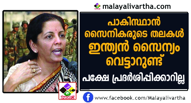 പാകിസ്ഥാൻ സൈനികരുടെ തലകൾ ഇന്ത്യൻ സൈന്യം വെട്ടാറുണ്ടെന്നും എന്നാൽ അത് പ്രദർശിപ്പിക്കാറില്ലെന്നും പ്രതിരോധമന്ത്രി നിർമല സീതാരാമൻ. ഒരു ദേശീയ വാര്ത്താ ചാനലിനു നല്കിയ അഭിമുഖത്തില് സംസാരിക്കുകയായിരുന്നു മന്ത്രി.