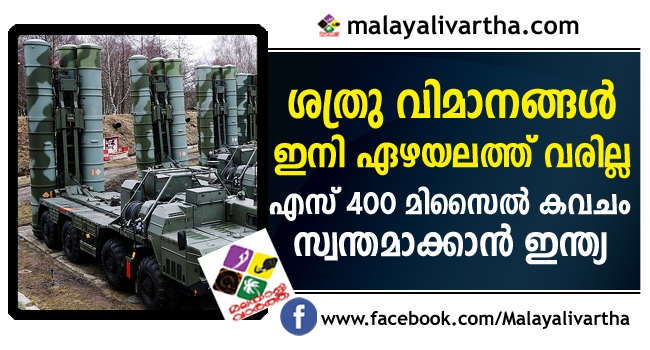 ഇന്ത്യന് വ്യോമപരിധിയെ കാത്തു സൂക്ഷിക്കാന് ഉതകുംവിധം കരയില് നിന്നും ആകാശത്തേക്ക് തൊടുക്കാവുന്ന റഷ്യന് നിര്മിത എസ് 400 ട്രയംഫ് വ്യോമപ്രതിരോധ മിസൈലുകള് വാങ്ങുന്നതിനുള്ള കരാറില് ഇന്ത്യന് ഉടന് ഒപ്പിടും. വാര്ഷിക ഇന്ത്യന് -റഷ്യന് സമ്മേളനത്തിന് ഒക്ടോബര് 4-ന് ഡല്ഹിയിലെത്തുന്ന റഷ്യന് പ്രസിഡന്റ് വ്ലാദ്മിര് പുടിനുമായിട്ടായിരിക്കും കരാര് ഒപ്പിടുന്നത്. പുടിന്റെ സന്ദര്ശനത്തിന്റെ പ്രധാന ഉദ്ദേശങ്ങളിലൊന്ന് മിസൈല് കരാര് ഒപ്പിടുകയെന്നതാണെന്ന് അദ്ദേഹത്തിന്റെ വിദേശകാര്യ സെക്രട്ടറി യൂറി യുഷാകോവ് വ്യക്തമാക്കി. 5 ബില്യന് അമേരിക്കന് ഡോളര് (ഏതാണ്ട് 36,000 കോടിരൂപ) മതിപ്പ് വരുന്നതാണ് കരാറെന്നും അദ്ദേഹം വ്യക്തമാക്കി. ഇതിന് പുറമെ നാല് യുദ്ധക്കപ്പലുകള് കൂടി റഷ്യ ഇന്ത്യയ്ക്ക് കൈമാറും.