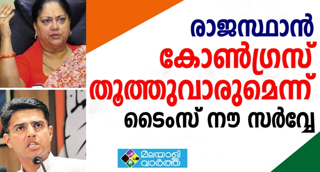 രാജസ്ഥാനിലെ നിയമസഭാ തിരഞ്ഞെടുപ്പില് കോണ്ഗ്രസ് പാര്ട്ടി നല്ല ഭൂരിപക്ഷത്തോടെ അധികാരത്തില് വരുമെന്നാണ് അഭിപ്രായ സര്വേ വന്നിട്ടുള്ളത്. ടൈംസ് നൗസിഎന്എക്സ് സംസ്ഥാനത്തിന്റെ വിവിധ ഭാഗങ്ങളിലെ 8040പേരെ കണ്ടു തിരഞ്ഞെടുപ്പിനു മുന്നോടിയായി നടത്തിയ അഭിപ്രായ സര്വേയിലെ ഫലമാണു ഭരണകക്ഷിയായ ബിജെപിയെ പിന്നിലാക്കി കോണ്ഗ്രസ് അധികാരത്തിലെത്തുമെന്നു പ്രവചിക്കുന്നത്. മുഖ്യമന്ത്രി വസുന്ധര രാജെയുടെ പ്രകടനം മോശമാണെന്നു സര്വേയില് പങ്കെടുത്തവരില് 48% പേരും അഭിപ്രായപ്പെട്ടു.