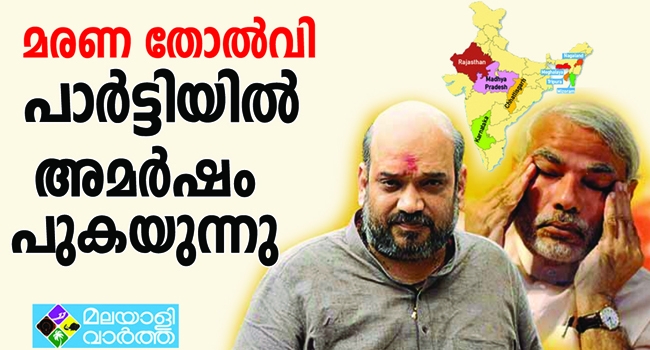 സെമിഫൈനലിൽ നേരിട്ട കനത്ത തോൽവിക്ക് പിന്നാലെ ബിജെപിയില് അമര്ഷം ആളിക്കത്തുന്നു. 2014 ലെ ലോക്സഭാ തെരഞ്ഞെടുപ്പിലും അതിനു ശേഷം ഉണ്ടായ വിജയങ്ങളെ കൊട്ടിഘോഷിച്ചും അതിന്റെ മുഴുവന് ക്രഡിറ്റും അവകാശപ്പെട്ട മോഡി-അമിത് ഷാ കൂട്ടുകെട്ട്, ഹിന്ദി ഹൃദയഭൂമിയിലെ പരാജയത്തില് പാലിക്കുന്ന മൗനത്തിനെതിരെ പാര്ട്ടിക്കുള്ളില്നിന്നുതന്നെ വിമത ശബ്ദമാണ് ഉയരുന്നത്. ഇത് വരെ അടക്കി നിർത്തിയിരുന്ന വിമത ശബ്ദങ്ങൾ ഇനി ആളിക്കത്തും.