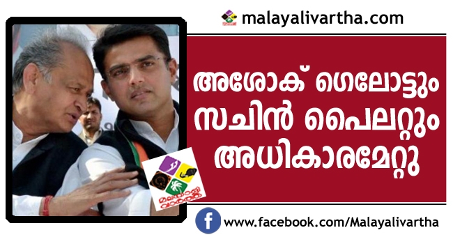 രാജസ്ഥാന് മുഖ്യമന്ത്രി അശോക് ഗെഹ് ലോട്ടും ഉപമുഖ്യമന്ത്രിയായി സചിന് പൈലറ്റും സത്യപ്രതിജ്ഞ ചെയ്ത് അധികാരമേറ്റു. ജയ്പുരിലെ ചരിത്ര പ്രസിദ്ധമായ ആല്ബര്ട്ട് ഹാളില് നടന്ന സത്യപ്രതിജ്ഞാ ചടങ്ങില് ഗവര്ണര് ഇരുവര്ക്കും സത്യവാചകം ചൊല്ലി കൊടുത്തു. 67കാരനായ അശോക് ഗെഹ് ലോട്ട് മൂന്നാം തവണയാണ് രാജസ്ഥാന് മുഖ്യമന്ത്രി പദത്തില് എത്തുന്നത്.