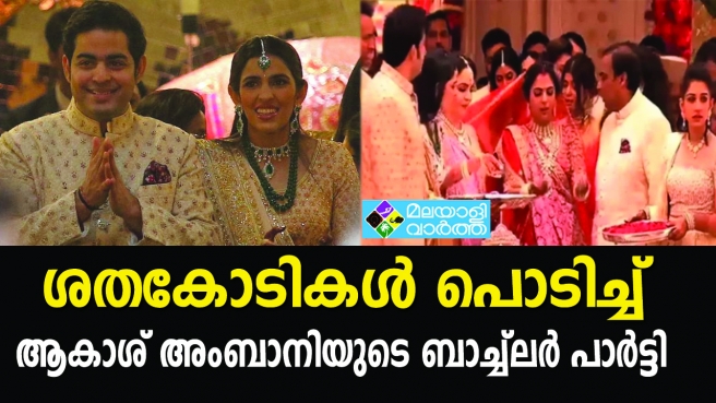 ശതകോടികള് പൊടിച്ച് ആകാശ് അംബാനിയുടെ ബാച്ച്ലര് പാര്ട്ടി. ഒപ്പം പറന്ന് താരനിര. അംബാനി കുടുംബത്തില് അടുത്ത കല്യാണമേളം. ആകാശ് അംബാനി–ശ്ലോക മേത്ത വിവാഹം മാര്ച്ച് 9 ന്. ആഡംബരത്തില് ഇഷയെ വെല്ലുമോ. ആഡംബരത്തിന്റെ പരകോടിയിലായിരുന്ന ഇഷ അംബാനിയുടെ വിവാഹത്തെ കടത്തിവെട്ടുമോ. രാജ്യം സാക്ഷിയായ ഏറ്റവും ആഡംബര വിവാഹത്തിനു പിന്നാലെ മറ്റൊരു വിവാഹത്തിനും അംബാനി കുടുംബം ഒരുങ്ങുമ്പോള് ഏവരും ഉറ്റുനോക്കുന്നതും അതാണ്.