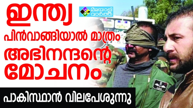 ഇന്ത്യ പിന്വാങ്ങിയാല് മാത്രം അഭിനന്ദന്റെ മോചനം; പാകിസ്ഥാന് വിലപേശുന്നു; വിങ് കമാന്ഡര് അഭിനന്ദന് വര്ധമാനെ മോചിപ്പിക്കണമെന്ന് ഇന്ത്യ പാക്കിസ്ഥാനോട് ആവശ്യപ്പെട്ടു. അഭിനന്ദന് നയതന്ത്രസഹായം ലഭ്യമാക്കണമെന്ന് ഇന്ത്യ ആവശ്യപ്പെട്ടു