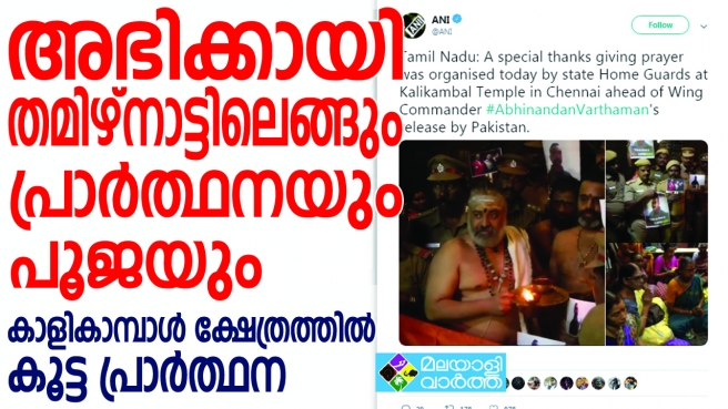 അഭിനന്ദ് വര്ത്തമാന്, ആ പേര് ഒരു ഇന്ത്യാക്കാരനും ഇനി ഒരിക്കലും മറക്കില്ല. ഭാരത് മാതാക്കീ ജയ് വിളിച്ച് അവസാന നിമിഷം വരെ ചെറുത്തുനിന്നു. ആക്രമിക്കാന് വന്നവര്ക്ക് നേരെ കൈതോക്കുകൊണ്ട് വെടിയുതിര്ത്തു. രേഖകള് മുഴവന് വെള്ളത്തില് ഒഴുക്കിയും വിഴുങ്ങിയും ഇല്ലാതാക്കി: അഭിനന്ദ് വര്ത്തമാന് രാജ്യം മുഴുവന് നിങ്ങള്ക്കൊപ്പം. മുന് എയര് മാര്ഷല് എസ് വര്ത്തമാന്റെ മകനായ അഭിനന്ദന്റെ ധീരത രാജ്യം മാത്രമല്ല ലോകവും ഉരുവിട്ടുകൊണ്ടിരിക്കുകയാണ്.