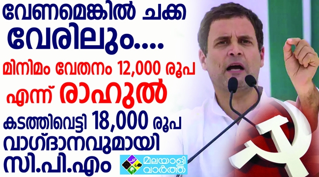 ലോകത്തിലെ ഏറ്റവും വലിയ ദാരിദ്ര്യനിർമാർജന പദ്ധതി എന്നു വിശേഷിപ്പിച്ച രാഹുലിന്റെ മിനിമം വേതന പദ്ധതിയെ കടത്തിവെട്ടി 18,000 രൂപ വാഗ്ദാനവുമായി സി പി എം . ഇതെല്ലം വെറും തിരഞ്ഞെടുപ്പ് സ്റ്റണ്ട് മാത്രമല്ല ,മനസ്സ് വെച്ചാൽ ഭരിക്കുന്നവർക്ക് പ്രാവർത്തികമാക്കാവുന്നവ തന്നെയാണ്