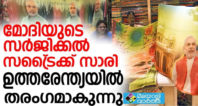 കറുത്ത നിറമുള്ള തുണിയില് മോദിയുടെ ചിത്രവും പൂക്കളുമൊക്കെ ആലേഖനം ചെയ്തിരിക്കുന്ന സാരികള്ക്കാണ് മധ്യപ്രദേശിലെ ജബല്പൂരില് ഏറെ ആവശ്യക്കാറുണ്ട്. ഈ സാരിയുടെ പേര് സര്ജിക്കല് സ്ട്രൈക്ക് എന്നാണ്. മന് കീ ബാത്ത്, സര്ജിക്കല് സ്ട്രൈക്ക്, എയര് സ്ട്രൈക്ക്,മോദി വിഷന് എന്നിങ്ങനെയൊക്കെയാണ് സാരികള്ക്ക് പേര്. പൂക്കളും ഡിസൈനുകളും മാത്രമല്ല രണ്ടായിരം രൂപാ നോട്ടിന്റെ ചിത്രവും മോദിക്കൊപ്പം ചില സാരികളില് ഇടം പിടിച്ചിട്ടുണ്ട്.