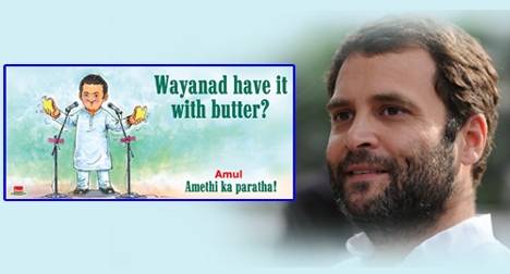 ഇപ്പോള് ഇതാ രാഹുല് ഗാന്ധിയെ ട്രോളി സാക്ഷാല് അമൂല് കമ്ബനി തന്നെ രംഗത്തെത്തിയിരിക്കുകയാണ്. അമുലിന്റെ പുതിയ പരസ്യത്തിലൂടെയാണ് രാഹുലിനെ ട്രോളിയിരിക്കുന്നത്. കോണ്ഗ്രസ് പ്രസിഡന്റ് രണ്ട് സീറ്റുകളില് മത്സരിക്കുന്നുവെന്ന അടിക്കുറിപ്പിനൊപ്പം രാഹുല് ഗാന്ധിയുടെ കാരിക്കേച്ചറും 'വയനാട് ഹാവ് ഇറ്റ് വിത്ത് ബട്ടര്'(ഇത് വെണ്ണ ചേര്ത്ത് കഴിക്കാമോ)എന്നെഴുതിയ ചിത്രവുമാണ് അമുലിന്റെ പരസ്യത്തെ രസകരമാക്കുന്നത്. 'അമുല് അമേഠി കാ പറാത്ത' (അമേഠിയുടെ പറാത്ത) എന്നും ചിത്രത്തില് വിശേഷിപ്പിച്ചിട്ടുണ്ട്.