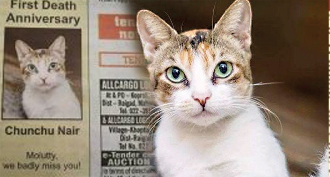 ഒരു ഇംഗ്ലീഷ് പത്രത്തിന്റെ മുംബൈ എഡിഷനില് ഞായറാഴ്ചയായിരുന്നു പരസ്യം. ഒന്നാംചരമവാര്ഷികം തലക്കെട്ടില് ‘മോളൂട്ടി വീ ബാഡ്ലി മിസ് യൂ’ എന്നാണ് അമ്മയും അച്ഛനും ചേച്ചിമാരും ചേട്ടന്മാരും ചേർന്ന് നൽകിയ പരസ്യത്തിലെ വാക്കുകൾ. പൂച്ചയുടെ ‘ചുഞ്ചു നായര്’ എന്ന പേരാണ് ട്രോളന്മാരെ പ്രകോപിപ്പിച്ചത്.