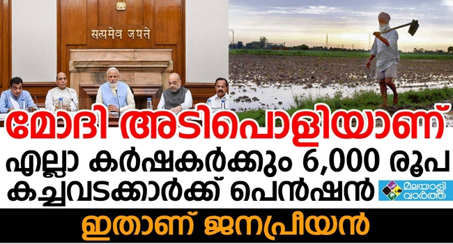 കര്ഷകര്ക്കും ചെറുകിട വ്യാപാരികള്ക്കും ഇളവുകള് പ്രഖ്യാപിച്ച് മോദി സര്ക്കാര്... ഭൂപരിധിയില്ലാതെ എല്ലാ കര്ഷകര്ക്കും 6,000 രൂപ സഹായം, കര്ഷകര്ക്ക് പ്രതിമാസം 3000 രൂപയുടെ പെന്ഷന് ലഭിക്കുന്ന പദ്ധതിക്കും അംഗീകാരമായി