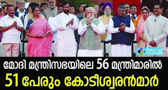 രണ്ടാം നരേന്ദ്ര മോദി മന്ത്രിസഭയിലെ 56 മന്ത്രിമാരില് 51 പേരും കോടീശ്വരന്മാര്; രണ്ടു കോടി രൂപയുടെ ആസ്തിയോടുകൂടി പ്രധാനമന്ത്രി നരേന്ദ്ര മോദി പട്ടികയില് നാല്പ്പത്തിയാറാമത്