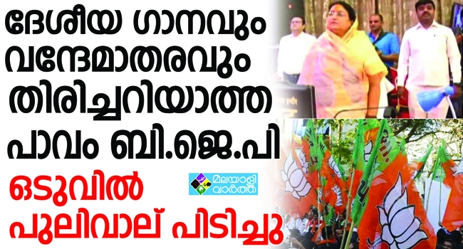 ദേശീയ ഗാനവും വന്ദേമാതരവും തിരിച്ചറിയാത്ത പാവം ബിജെപി; ദേശീയഗാന ആലാപനത്തിനിടെ ദേശീയ ഗാനം നിര്ത്തി ദേശീയഗീതം പാടിയ ബിജെപി നേതാക്കൾ വെട്ടിൽ