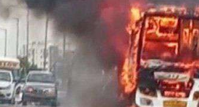 ബസില് യാത്രക്കാര് ഇല്ലായിരുന്നുവെന്നും െ്രെഡവര് ഉടന് രക്ഷപ്പെട്ടുവെന്നും അധികൃതര് അറിയിച്ചു. ഷോര്ട്ട് സര്ക്യൂട്ടാണ് അപകട കാരണമെന്ന് പ്രാഥമിക നിഗമനം.