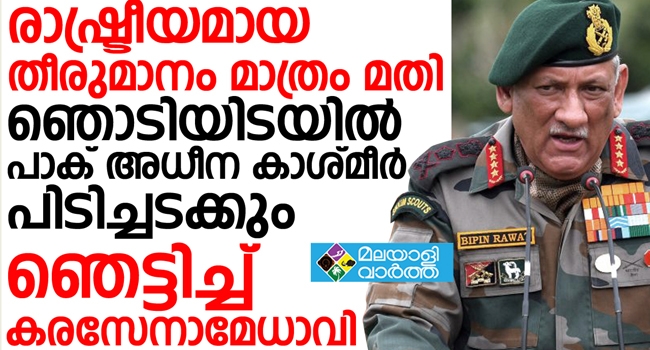 പാക് അധീന കശ്മീര് ഉള്പ്പെടെ ജമ്മുകശ്മീരിന് മേല് പൂര്ണമായും അവകാശം ഇന്ത്യയ്ക്കാണെന്ന് കരസേനാമേധാവി ജനറല് ബിപിന് റാവത്ത് അടിവരയിടുകയാണ്. കശ്മീരിന്റെ മറ്റ് ഭാഗങ്ങള് പാകിസ്താനില് നിന്ന് തിരിച്ചുപിടിക്കേണ്ടതെങ്ങനെ എന്നത് രാഷ്ട്രീയ തീരുമാനം ആയിരിക്കുമെന്നും സൈന്യം ഉത്തരവുകള് അനുസരിക്കുമെന്നും ബിപിന് റാവത്ത് വ്യക്തമാക്കുമ്പോള്.
