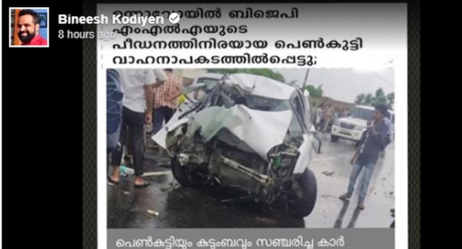 ഉന്നാവോ പെണ്കുട്ടിക്ക് നീതി ലഭിക്കണമെന്ന് ബിനീഷ് കോടിയേരിയുടെ ഫെയ്സ് ബുക്ക് പോസ്റ്റ്
