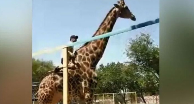 സഞ്ചാരികള് കടക്കരുതെന്ന മുന്നറിയിപ്പായി സ്ഥാപിച്ച വേലിയും മതിലുമെല്ലാം ചാടി കടന്ന് മദ്യലഹരിയിൽ യുവാവിന്റെ സാഹസം; കുതിരയെന്ന് കരുതി ജിറാഫിന്റെ പുറത്ത് വലിഞ്ഞുകയറി സവാരി