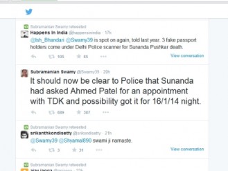 ടിഡികെ എന്നാണ് ട്വിറ്ററില് സോണിയയെ സ്വാമി വിശേഷിപ്പിക്കാറ്. സുനന്ദയുടെ മരണത്തില് വലിയ ദുരൂഹതയുണ്ടെന്ന് വ്യക്തമാക്കാന് കൂടിയാണ് ഇത്തരമൊരു ട്വീറ്റ് സ്വാമി പുറത്തുവിടുന്നത്.