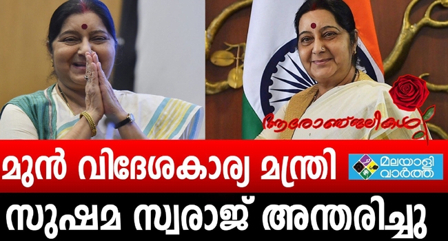 മുതിര്ന്ന ബിജെപി നേതാവും മുന് വിദേശകാര്യ മന്ത്രി സുഷമ സ്വരാജ് അന്തരിച്ചു... ഹൃദയാഘാതത്തെ തുടര്ന്ന് ഡല്ഹി എയിംസ് ആശുപത്രിയിലായിരുന്നു അന്ത്യം... ഒന്നാം മോദി മന്ത്രിസഭയിലെ വിദേശകാര്യമന്ത്രിയായിരുന്ന സുഷമ, ജനകീയ നിലപാടുകളിലൂടെ ജനശ്രദ്ധ പിടിച്ചുപറ്റിയ നേതാവായിരുന്നു