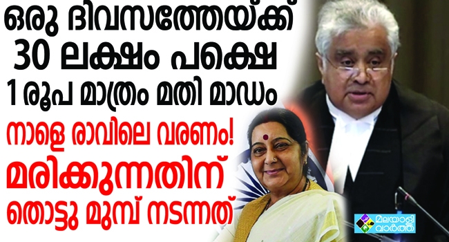 സുഷമ സ്വരാജ് മരിച്ചതിന് പിന്നാലെ മരിക്കുന്നതിന് തൊട്ട് മുമ്പ് നടന്ന സംഭവം വൈറലാകുകയാണ്. അന്താരാഷ്ട്ര നീതിന്യായ കോടതിയില് കുല്ഭൂഷന് ജാദവിന് വേണ്ടി വാദിച്ച മുതിര്ന്ന അഭിഭാഷകന് ഹരീഷ് സാല്വെ പ്രതിഫലമായി വാങ്ങിയത് ഒരു രൂപയാണെന്ന് നേരത്തെ റിപ്പോര്ട്ടുകള് പുറത്തു വന്നിരുന്നു. രാജ്യത്ത് ഏറ്റവും പ്രതിഫലം പറ്റുന്ന അഭിഭാഷകരില് ഒരാളാണ് ഹരീഷ് സാല്വെ. ഒരു ദിവസം ഹാജരാവാന് 30 ലക്ഷം വരെ അദ്ദേഹം പ്രതിഫലം കൈപ്പറ്റാറുണ്ടെന്നാണ് റിപ്പോര്ട്ട്.