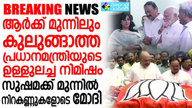 ബുധനാഴ്ച രാവിലെയാണ് പ്രധാനമന്ത്രിയും മറ്റു മന്ത്രിമാരും സുഷമാ സ്വരാജിന് അന്ത്യാഞ്ജലി അര്പ്പിക്കാനായി വീട്ടിലെത്തിയത്. സുഷമാ സ്വരാജിന്റെ ഭൗതിക ശരീരത്തില് പുഷ്പചക്രം അര്പിച്ച ശേഷം അവരുടെ ഭര്ത്താവ് സ്വരാജ് കൗശലുമായി സംസാരിക്കുന്നതിനിടെയാണ് മോദി വികാരാധീനനായത്. അദ്ദേഹത്തിന്റെ കണ്ണുകള് നിറയുന്നതും വിതുമ്പുന്നതും വീഡിയോ ദൃശ്യങ്ങളില് കാണാം.