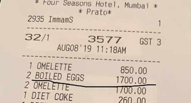 രണ്ട് പുഴുങ്ങിയ മുട്ടയ്ക്ക് 1700 രൂപ...