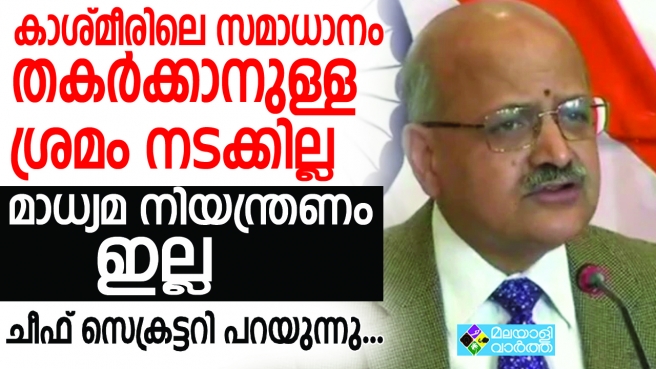 കാശ്മീരിലെ സമാധാനം തകര്ക്കാനുള്ള ചിലരുടെ ശ്രമങ്ങള് നടക്കില്ലെന്ന് ചീഫ് സെക്രട്ടറി ബി.വി.ആര് സുബ്രഹ്മണ്യം വാര്ത്താസമ്മേളനത്തില് വ്യക്തമാക്കി. ആഗസ്റ്റ് ആറ് മുതല് ഏര്പ്പെടുത്തിയിരിക്കുന്ന നിയന്ത്രണങ്ങള്ക്ക് ഇന്ന് രാത്രി മുതല് ഇളവ് വരും. ഇത് ഘട്ടം ഘട്ടമായാണ് നടപ്പാക്കുന്നത്. ഇന്ന് രാത്രി മുതല് ടെലഫോണ് നിയന്ത്രണം പിന്വലിക്കും. തിങ്കളാഴ്ച മുതല് സ്കൂളുകള് തുറന്ന് പ്രവര്ത്തിക്കും. നിയന്ത്രണം തുടങ്ങി ഇത്രയും ദിവസം പിന്നിട്ടിട്ടും ഒരു ജീവന്പോലും പൊലിഞ്ഞിട്ടില്ല എന്നത് വലിയ നേട്ടമാണെന്നും ചീഫ് സെക്രട്ടറി അവകാശപ്പെട്ടു. ലഷ്കര് ഇ തൊയ്ബ അടക്കമുള്ള സംഘനകളുടെ ഭീഷണി സംസ്ഥാനത്ത് നിലനില്ക്കുന്നതിനാലാണ് നിയന്ത്രണങ്ങള് ഒറ്റയടിക്ക് എടുത്ത് മാറ്റാതെ ഘട്ടംഘട്ടമായി ഒഴിവാക്കുന്നതെന്നും അദ്ദേഹം മാധ്യമങ്ങളോട് പ്രതികരിച്ചു. സംസ്ഥാനത്തെ സര്ക്കാര് ഓഫീസുകള് ഇന്ന് മുതല് പ്രവര്ത്തിച്ച് തുടങ്ങി.