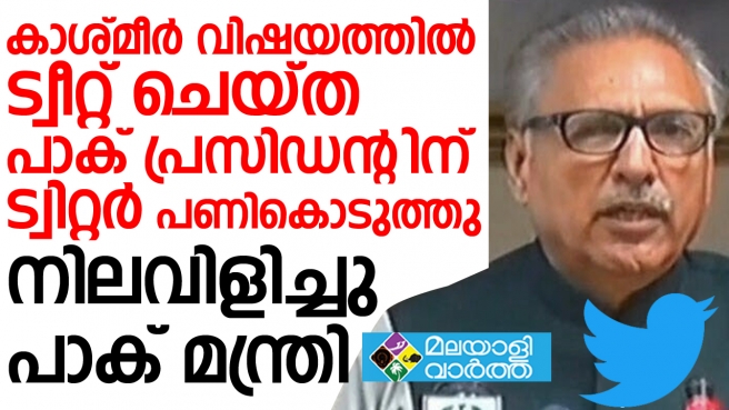 കശ്മീര് വിഷയത്തില് ട്വീറ്റ് ചെയ്ത പാകിസ്ഥാന് പ്രസിഡന്റിന് ട്വിറ്ററിന്റെ നോട്ടീസ്