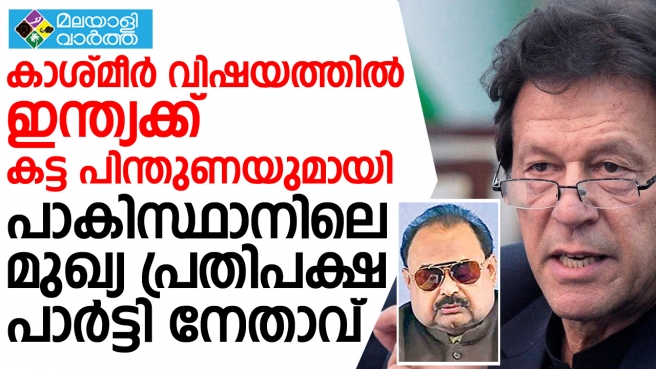 കാശ്മീർ വിഷയത്തിൽ ഇന്ത്യക്ക് കട്ട പിന്തുണയുമായി പാകിസ്ഥാനിലെ മുഖ്യ പ്രതിപക്ഷ പാർട്ടി നേതാവ്. ജമ്മു കശ്മീരിനുള്ള പ്രത്യേക പദവി നീക്കിയ ഇന്ത്യൻ സർക്കാരിന്റെ നടപടി ഇന്ത്യയുടെ ആഭ്യന്തര കാര്യമാണെന്നും അതിന് ഇന്ത്യൻ ജനതയുടെ അഭൂതപൂർവമായ പിന്തുണയുണ്ടെന്നും പാക്കിസ്ഥാനിലെ മുത്താഹിദ ഖ്വാമി മൂവ്മെന്റ് (എംക്യുഎം) സ്ഥാപകൻ അൽതാഫ് ഹുസൈൻ പറഞ്ഞു.